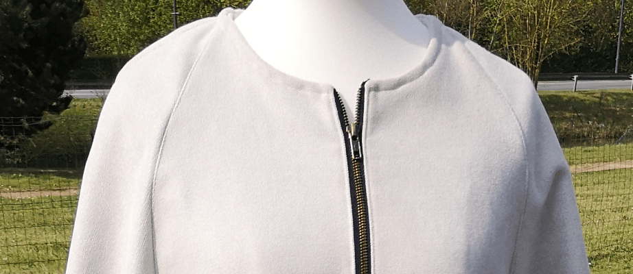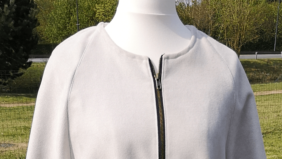 On voit sur cette photo la face intérieure en polaire noire. J’ai donc ajouté une fermeture éclair entre les devants et la parmenture prévue dans le patron de base. Je l’ai choisie de couleur noire pour contraster avec le blanc et rappeler la couleur de la doublure polaire.