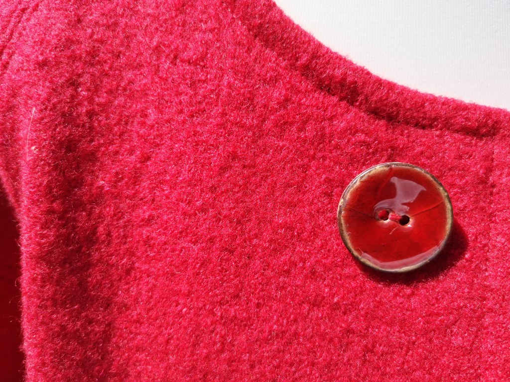 La boutonnière a été coupé à cru (juste une fente dans la laine bouillie). Le bouton façon « émaux », que je trouve magnifique et original, provient de chez TTC 2000 à Calais.